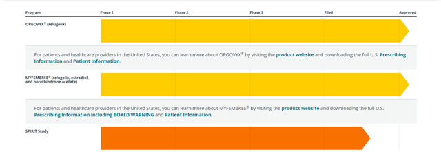 In September 2021, the Companies announced the acceptance of their supplemental new drug application for MYFEMBREE® (relugolix 40 mg, estradiol 1 mg, and norethindrone acetate 0.5 mg) for the management of moderate to severe pain associated with endometriosis. The application is supported by data from the Phase 3 SPIRIT program consisting of two pivotal clinical studies (SPIRIT 1 and SPIRIT 2), which evaluated 1,200 women with pain associated with endometriosis for 24 weeks. In addition, the Company has also submitted an open-label extension study for eligible women who completed either SPIRIT 1 or SPIRIT 2 through one year. The candidates Prescription Drug User Fee Act (PDUFA) is set for May 6, 2022.