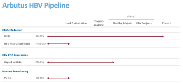 Arbutus’s pipeline consists of AB-729, an RNAi that is currently being evaluated in a Phase 1 trial in HBsAg reduction. AB-729 has demonstrated safety, tolerability and a robust and continuous decline in hepatitis B surface antigen (HBsAg) in subjects with chronic hepatitis B (HBV). The Company intends to initiate multiple Phase 2 proof-of-concept combination trials in 2021, and has already started initial screening in a phase 2 proof-of-concept combination trial to evaluate AB-729 in combination with Assembly Biosciences’ lead core (capsid) inhibitor candidate vebicorvir and a nucleos(t)ide reverse transcriptase inhibitor for the treatment of subjects with chronic HBV infection.