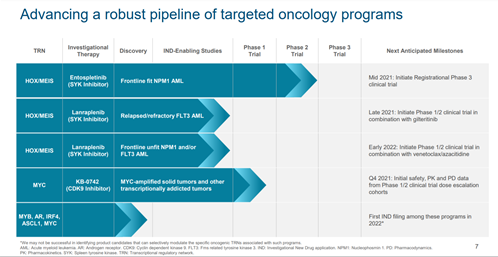 Kronos is also working on KB-0742, intended for the treatment of MYC-amplified solid tumors, which is currently undergoing a phase 1/ 2 trial and is expected to announce initial safety, PK and PD data in Q4,2021.