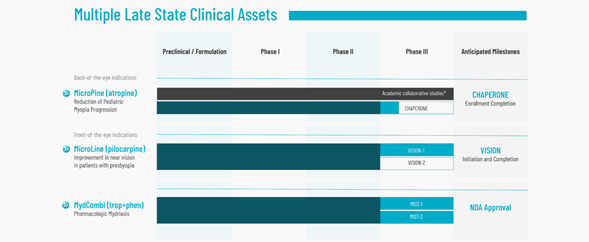 Eyenovia’s clinical pipeline has MicroPine (atropine) intended for arresting the progression of pediatric myopia and MicroLine (pilocarpine), a treatment for improvement of near vision in patients with presbyopia.