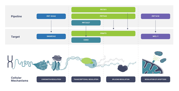 The Company’s pipeline consists of PRT543 and PRT811, candidates that selectively inhibit PRMT5. PRT543, is currently being evaluated in a Phase 1 clinical trial, in advanced solid tumors and select myeloid malignancies such as adenoid cystic carcinoma (ACC), myelofibrosis (MF), genomically-selected myelodysplastic syndrome (MDS) among others. PRT811, is being developed for the treatment of central nervous system (CNS) tumors such as glioblastoma multiforme (GBM) and primary CNS lymphoma and is currently undergoing a phase 1 clinical trial.