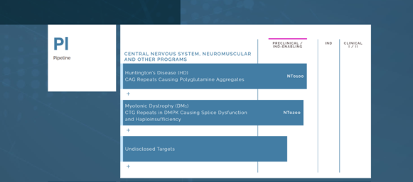 The Company is developing the NT0100 program for the treatment of Huntington’s disease (HD), which is currently undergoing preclinical development, with plans to file an IND for NT0100 by the end of 2021. Additionally, the Company is also developing NT0200 for the treatment of Myotonic dystrophy type 1 (DM1), which is a rare, autosomal disorder that results in progressive muscle wasting and weakness. The Company intends to file for an IND for the candidate in the fourth quarter of calendar year 2022.