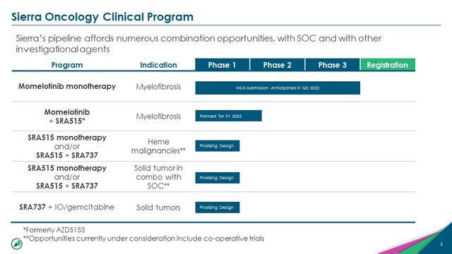 In August 2021, the Company acquired a BRD4 BET inhibitor named AZD5153 from AstraZeneca (NASDAQ: AZN) with plans to test it in a phase 2 trial with momelotinib. The candidate has been evaluated in a Phase 1 trial in solid tumor and lymphoma and demonstrated safety and tolerability, however it is yet to show evidence that it can improve anti-tumor activity in humans. The drug was dropped from Astrazeneca’s pipeline in 2019 and has now been picked up by Sierra. The Company has paid $8 million in upfront payment, with a potential $208 million in milestones for exclusive global rights. Sierra intends to initiate a Phase 2 clinical trial evaluating the combination of momelotinib and SRA515 in the first of 2022.