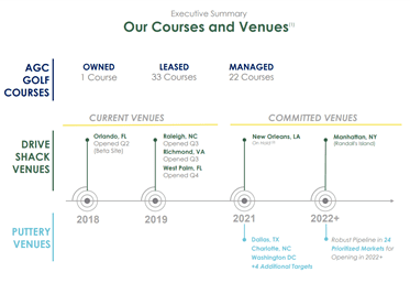 The Company has sold a major portion of its owned courses and is now focused on leasing and managing courses. The first Drive Shack was opened in Orlando in April,2018, which served as the testing site, which led to the launch of three new sites in the second half of 2019 at Raleigh, Richmond and West Palm Beach, which exceeded performance expectations and beat revenue plans by 14 percent.
