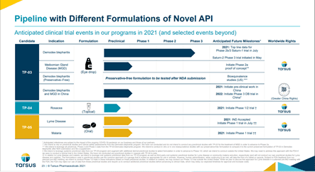 Tarsus is currently engaged in a phase 2a proof of concept in MGD and a Phase 1/2 trials in rosacea, Lyme disease and malaria.