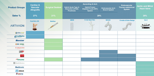 Artivion has four primary product families: aortic stent grafts, surgical sealants, On-X® mechanical heart valves, related surgical products, and implantable cardiac and vascular human tissues. Aortic stent grafts include aortic arch stent-grafts, abdominal stent-grafts, and synthetic vascular grafts. Aortic arch stent grafts include E-vita Open NEO, E-vita Open Plus, the Ascyrus Medical Dissection Stent (AMDS) hybrid prosthesis, the NEXUS® endovascular stent graft system (NEXUS), and E-vita Thoracic 3G products.