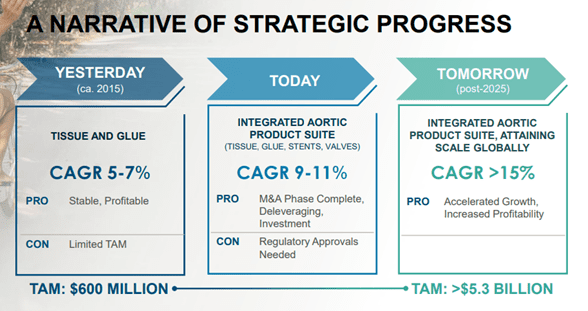 In 2015, the Company operated mainly in the tissue and glue segments with a TAM of $600 million. Over the years, it has expanded its product suite and is scaling globally to achieve an expected CAGR of more than 15% post-2025.