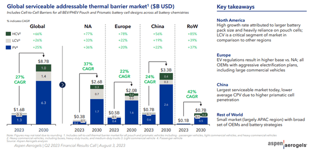 Aspen is also developing several promising aerogel products and technologies for the electric vehicle market. As per Aspen Aerogels analysis, the serviceable addressable market of pouch and prismatic cell packs of $1.6B is growing at 27% CAGR to $8.7B by 2030.