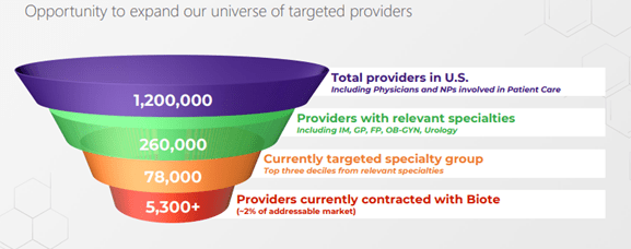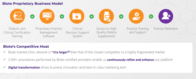 Biote operates a high-growth practice-building business within the hormone optimization space, similar to a franchise model. The Biote Method provides certified practitioners with the following components developed explicitly for practitioners in the hormone optimization space: Biote Method education, training, and certification, practice management software, inventory management software, and information regarding available Hormone Replacement Therapy (HRT) products, as well as digital and point-of-care marketing support.