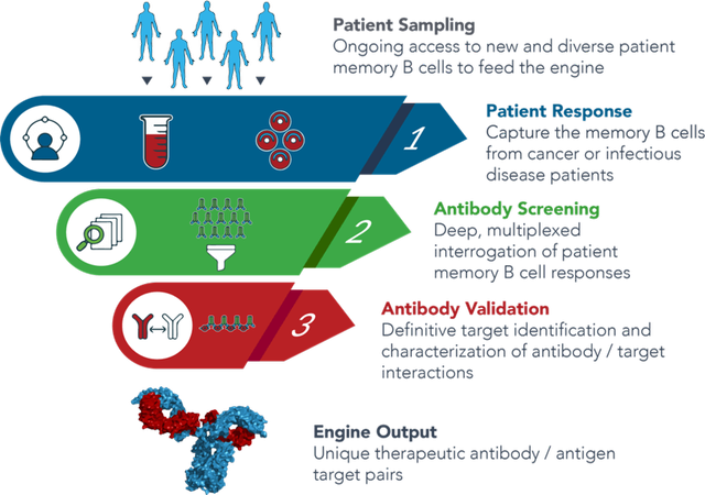 Immunome leverages its Discovery Engine to extract information present in “highly-educated” B cells, in patients who have the ability to fight their illnesses. The approach enables the discovery of antigens and native-antibodies obtained from patients, which can bind to these targets with high affinity.