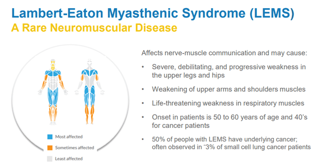 The company works with several rare disease advocacy organizations (including Global Genes, the National Organization for Rare Disorders (NORD), and the Myasthenia Gravis Foundation of America) to help increase awareness and level of support for patients living with LEMS.