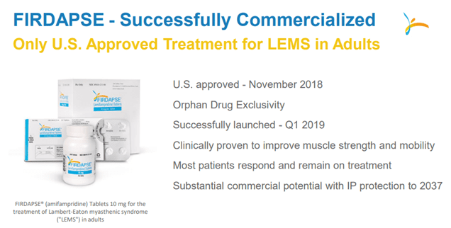 The company develops novel medicines for rare chronic neuromuscular and neurological diseases. Its main product is FIRDAPSE – amifampridine phosphate tablets for the treatment of Lambert-Eaton myasthenic syndrome or LEMS. At present, this is the only approved treatment for adults with LEMS in the U.S. The disorder currently affects about 3,000 people in the country.