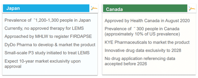 On August 6, 2020, the company announced that Canada’s national healthcare regulatory agency, Health Canada, had approved FIRDAPSE for treating patients in Canada with LEMS. On October 28, 2020, the company launched FIRDAPSE in Canada to treat patients with LEMS through a license and supply agreement with KYE Pharmaceuticals.