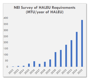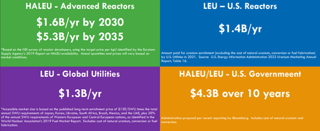 Hence, in the future, HALEU demand could become very large. The Nuclear Energy Institute (NEI) surveyed U.S. advanced reactor developers in 2020 to estimate potential HALEU demand through 2035. This estimate suggests a total market value of $1.6B/year by 2030 and $5.3B/year by 2035, and even if actual demand is lower than survey responses suggest, the market would still be huge.