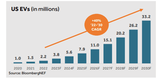 In response to the growing electrification trend, nearly all major automobile manufacturers have committed to producing EV models, with over 60 EV models anticipated to be available in 2023 from over 30 manufacturers and nearly a dozen more models coming onto the market soon. According to forecasts from the United States Department of Transportation and Bloomberg New Energy Finance (BNEF), approximately eight million EVs are expected to be on American roads by 2025, nearly 34 million EVs by 2030, and over 125 million by 2040, which would represent approximately 50% of all motor vehicles in the US.