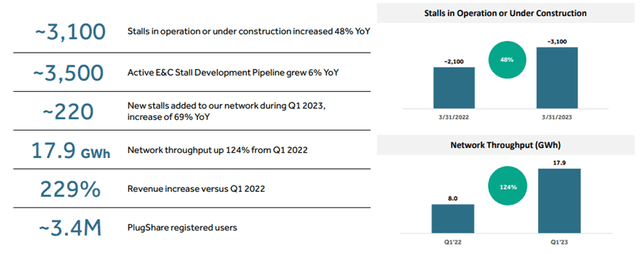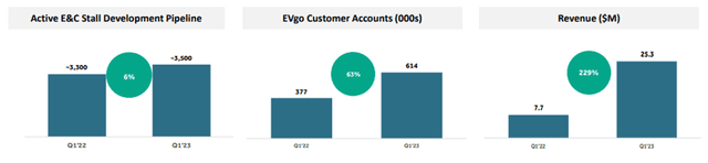 EVgo reported excellent results for Q1 FY23 – revenue grew to $25.3 million, representing an increase of 229% YoY. Network throughput reached 17.9 gigawatt-hours, an increase of 124% YoY.