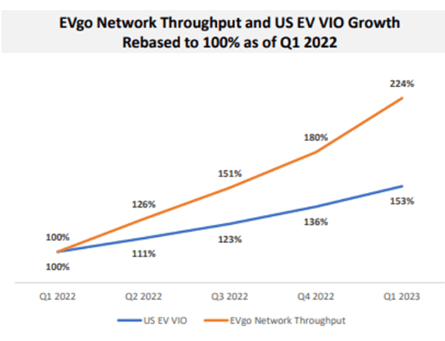 As seen from the above graph, specifically for Q1 2023, EVgo displayed throughput growth of 124% compared to VIO growth of 53% YoY. At the same time, operational stall growth was +33% – this indicates that kWh dispensed is increasing faster than stall growth. Growth in kWh per stall creates meaningful operating leverage in the EVgo model, allowing it to cement its position in the industry.