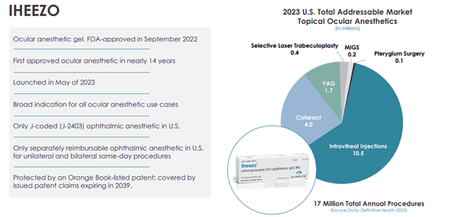 For any ocular procedure, a surgeon may require drugs for sedation, dilation, anesthesia, inflammation and infection prevention, and ocular surface preservation. The cataract surgery market continues to experience significant growth. According to Market Scope, approximately 4.8 million lens procedures were performed in the U.S. in 2021, 97% of which were cataracts, with the number expected to grow to 5.5 million lens procedures in 2026. Nearly 96% of the refractive surgery procedures performed are LASIK (laser in situ keratomileusis) surgeries, an outpatient surgical procedure used to treat nearsightedness, farsightedness, and astigmatism. According to an article published in 2021 in Clinical Ophthalmology, an estimated 800,000 eyes were treated with laser correction surgery (such as LASIK) each year for the previous ten years. Harrow’s Iheezo product has broad indications for all ocular anesthetic use cases.