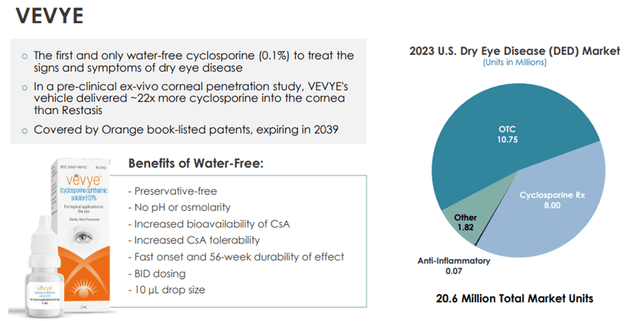 Dry eye occurs when the eye does not produce enough tears or when the tears are not of the correct consistency and evaporate too quickly. Inflammation of the surface of the eye may also occur. According to a 2023 Market Scope report, 39 million people in the U.S. suffer from both signs and symptoms of dry eye, with 49% of diagnosed dry eye patients having moderate to severe dry eye. The same report stated the global dry eye product market is expected to grow from $5.8 billion in 2023 to $7.5 billion in 2028. Dry eye is among the most common conditions seen by eye care professionals. Harrow’s Vevye is the first and only water-free cyclosporine (0.1%) to treat the signs and symptoms of dry eye disease. It, therefore, has the potential for widespread application in this market.