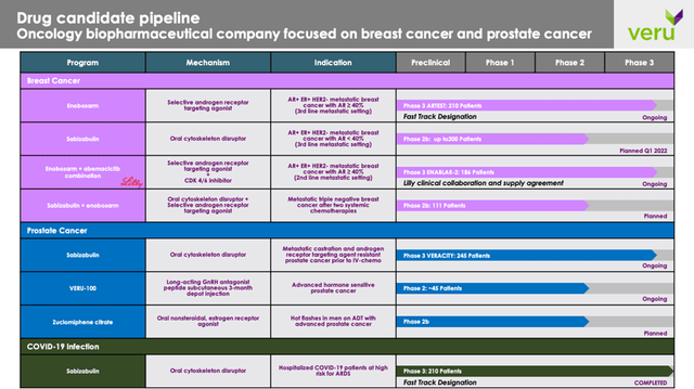 Besides COVID-19, sabizabulin will be evaluated in a planned Phase 2b study in AR+ ER+ HER2- metastatic breast cancer. The Company’s late-stage prostate cancer portfolio consists of sabizabulin (oral cytoskeleton disruptor) that is being evaluated in the Phase 3 VERACITY trial; VERU-100 (a GnRH antagonist peptide) currently undergoing Phase 2 trials and Zuclomiphene citrate, an oral nonsteroidal estrogen receptor agonist, which is being evaluated in a phase 2b trial.