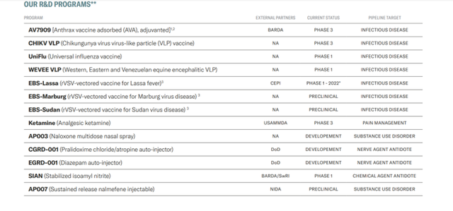 Emergent is developing an extensive pipeline of candidates consisting of CHIKV VLP (Chikungunya virus virus-like particle (VLP) vaccine) currently in Phase 3, UniFlu (Universal influenza vaccine) in Phase 1, WEVEE VLP (Western, Eastern, and Venezuelan equine encephalitic VLP) in Phase 1 EBS-Lassa (rVSV-vectored vaccine for Lassa fever) that will start Phase 1 trials in 2022, Ketamine (Analgesic ketamine) in Phase 3, besides multiple candidates in preclinical development.