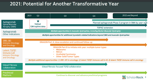Scholar Rock Holding intends to initiate a phase 3 program in Apitegromab by the end of 2021 and also pursue additional opportunities in other muscular dystrophies such as Becker Muscular Dystrophy and other myostatin-related indications.