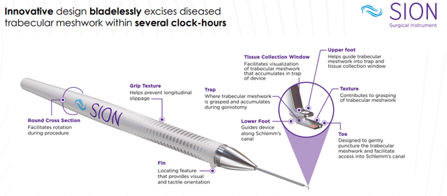SION is registered with the FDA as a Class I 510(k) exempt device. SION’s bladeless design, micro-engineered and precision manufactured using specialized lasers, excises tissue without cutting. SION grasps and removes diseased tissue as the surgeon sweeps the instrument around Schlemm’s canal with a single smooth motion. The bladeless technology of SION was developed with leading ophthalmic surgeons to improve safety and ease of use by eliminating the need to navigate sharp instrumentation within the eye’s anterior chamber and iridocorneal angle anatomy.