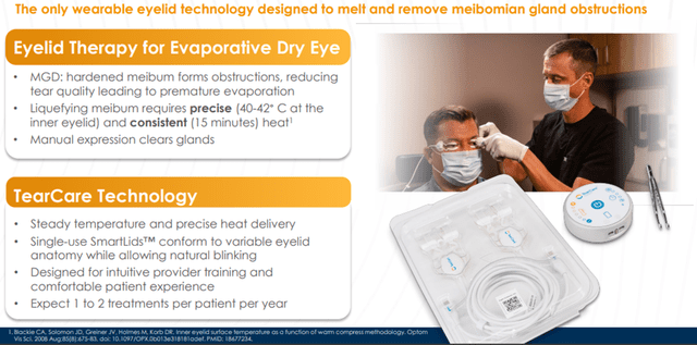 Additionally, the Company has one commercial product in the Dry Eye segment. TearCare is a unique open-eye heating and expression device designed to melt and remove meibomian gland obstructions. It has a compelling physiological profile to address obstruction from meibomian gland disease (MGD), the primary cause of evaporative DED, a condition characterized by low-quality tears that evaporate prematurely.