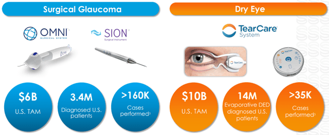 The annual addressable U.S. market opportunities for the products in surgical glaucoma and dry eye segments are approximately $6 billion and roughly $10 billion, respectively, while 2022 U.S. manufacturer revenues in surgical glaucoma and DED markets were roughly $466 million and $2.1 billion, respectively, demonstrating that currently available solutions have not addressed a large part of the market need.