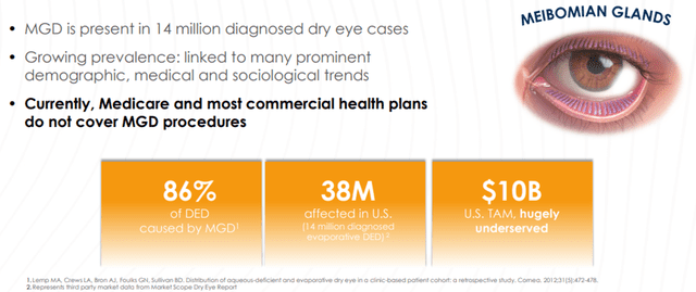 So far as Dry Eye Disease is concerned, studies have shown that evaporative DED resulting from MGD is associated with approximately 86% of all DED cases. As mentioned earlier, this translates into a market of about $ 10 billion for TearCare.