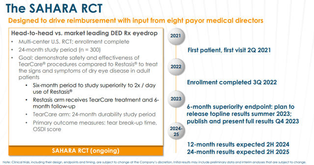 Sight Sciences has also developed robust clinical data evaluating TearCare. It has completed one RCT for TearCare (OLYMPIA) and completed enrolling patients in SAHARA RCT (SAHARA) in the third quarter of 2022. Data from OLYMPIA supported the FDA clearance of TearCare’s expanded indication for use in December 2021. Sight Sciences plans to leverage the results of OLYMPIA and SAHARA studies to support FDA clearances to develop symptoms for using TearCare and to support patient access strategy.