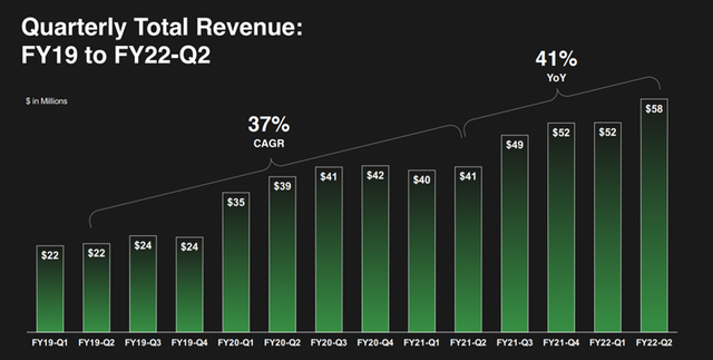 As per its Q2,2022 financial results, the Company’s revenue increased by 41% YoY to reach $58.3 million, while subscription revenue grew by 32% to reach $47.4 million. Gross profit grew by 35 percent at $42.3 million. The subscription revenue constituted $47.4 million or 81% of the total revenue, while professional services revenue brought in $10.9 million or 19 % of the total revenue.